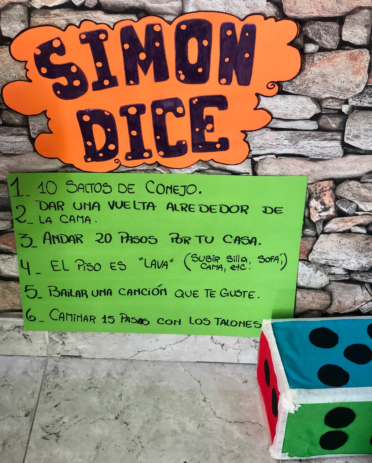 Descripción: enfrentados (con ayuda de algún familiar), colocar el objeto elegido en el medio, dar play a la música y seguir la siguiente secuencia de movimiento: con ambas manos me toco la cabeza, luego los hombros, continúo por la cintura, rodillas y pies; detener la música y en ese momento tratar de agarrar el objeto el que logra atraparlo obtendrá un punto. El jugador que consiga primero cinco puntos será el ganador.