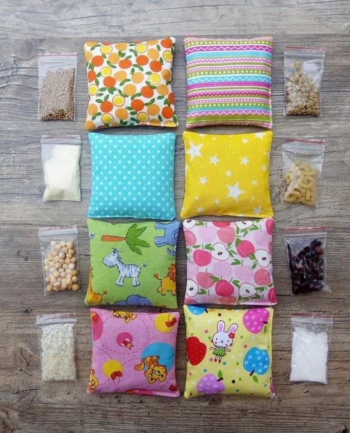 Materiales: retazos de tela, arroz, lentejas, porotos, etc.